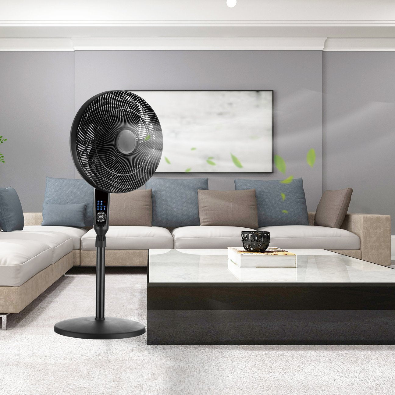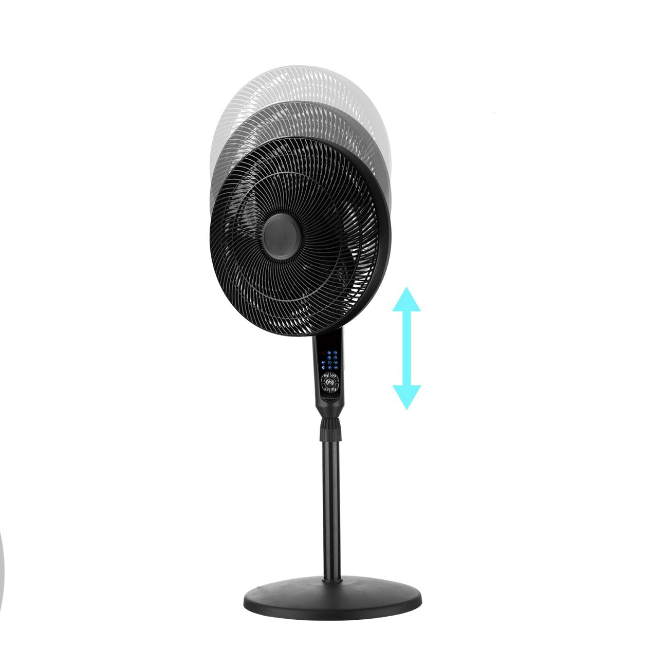 5 function buttons: power、4 speed、 3 mode、 7.5h timer、300° oscillation.