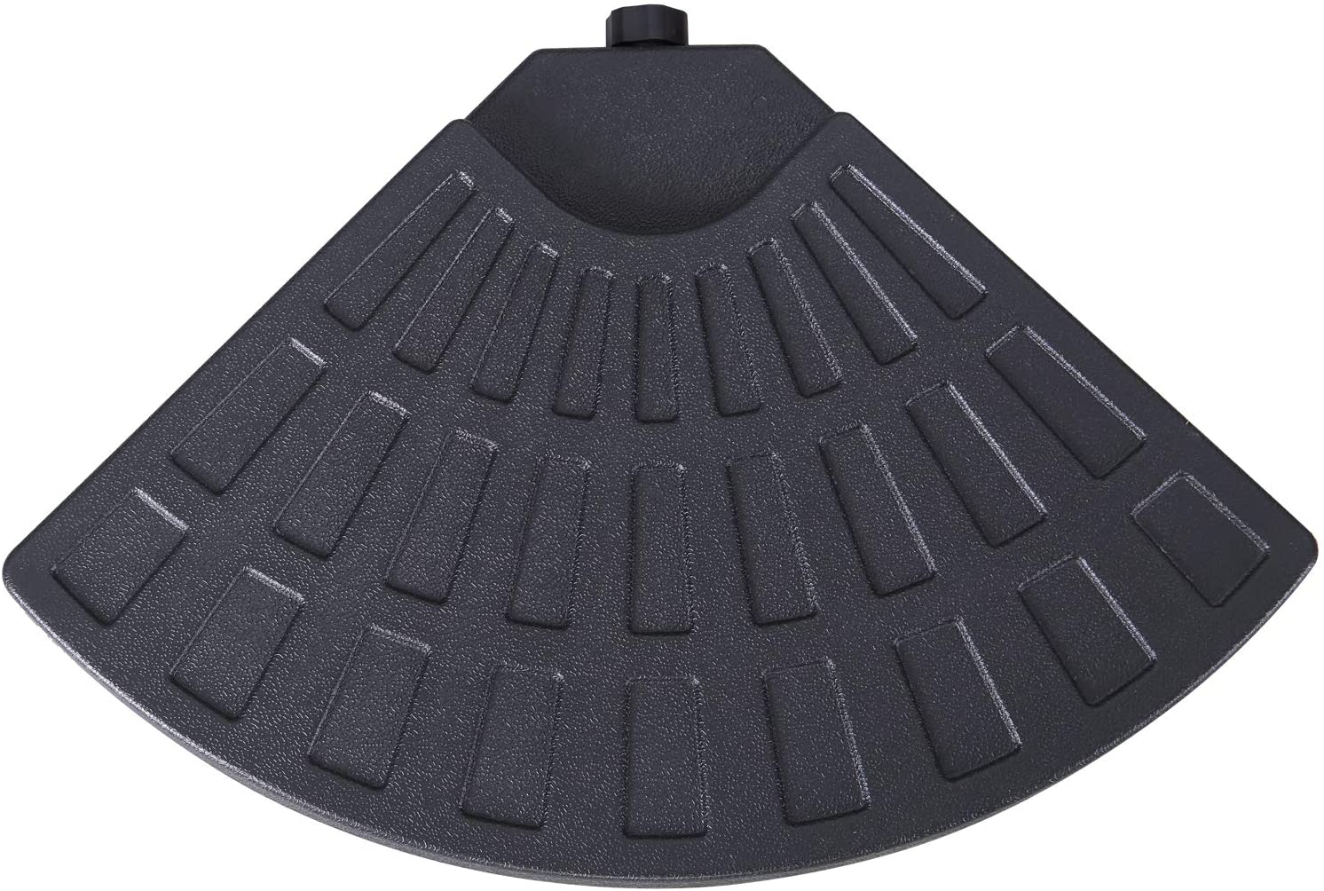 Designed to specifically fit a crossbar base, the umbrella stabilizer features a round, fan-like format with four interlocking plates that keep the structure in place. Using the built-in spouts, fill the base with 145 pounds of sand or 112 pounds of water and experience enhanced stability in windy conditions. Note: water and sand is not included in shipment and must be obtained separately.